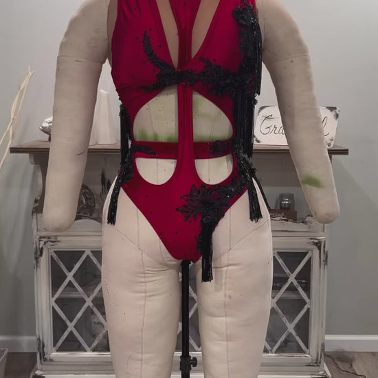 Red and black costume. This costume is embellished with beaded appliques and beaded fringe.
